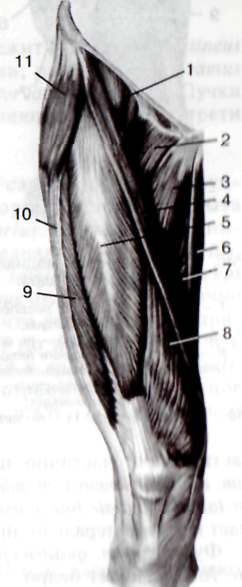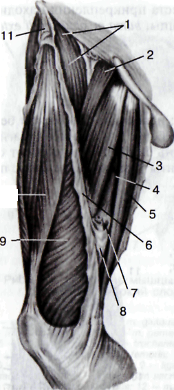 | Рис. 5.30. Мышцы бедра (вид спереди). 1 – m. liopsoas; 2 – m. lacuna vasorum; 3 – m. pectineus; 4 – m. adductor longus; 5 – m.sartorius; 6 – m. gracilis; 7 – m. rectus femoris; 8 – m. vastus medialis; 9 – m. vastus lateralis; 10 – tractus iliotibialis; 11 – m. tensor fasciae latae. | Рис. 5.31. Передняя и медиальная группы мышц бедра. 1 — m. iliopsoas; 2 — m. pectineus; 3 — m. adductor longus; 4 — m. adductor magnus: 5 — m. gracilis; 6 — septum intermusculare femoris mediale; 7 — canalis adductorius; 8 — lamina vastoadductoria; 9 — m. vastus medialis; 10 — m. rectus temoris; 11 — m. sartorius. |