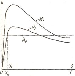 Рисунок 1. Механическая характеристика двигателя при номинальном М1 и пониженном М2 напряжениях