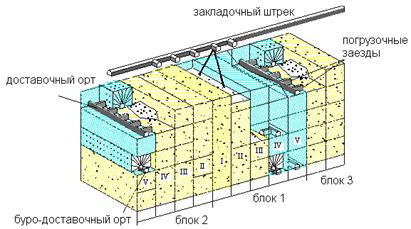 Блок подготавливается на уровнях горизонтов откаточным и вентиляционным штреками, откаточными ортами через 100 м и транспортным уклоном с заездами на доставочные горизонты. Доставочные горизонты проходятся по высоте через 12 м от уровня откаточного горизонта и до верхней границы блока и включают в себя доставочный и вентиляционный штреки.