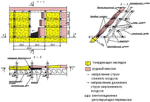 Для обеспечения проветривания горных работ предусматриваются вентиляционно-ходовые, вентиляционные восстающие, для перепуска руды на откаточный горизонт - два рудоспуска, для подачи закладки - закладочные выработки и скважины.