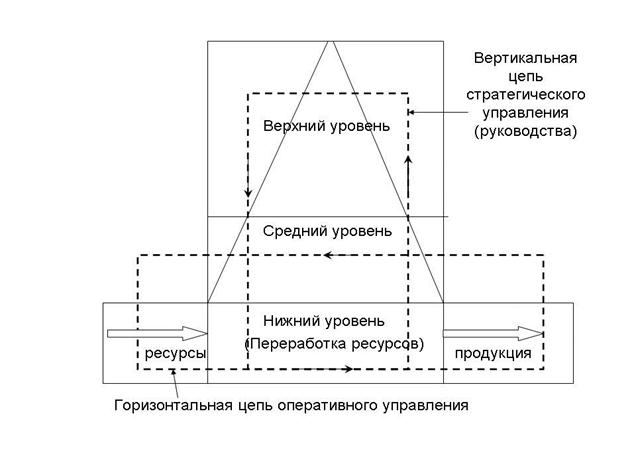 В результате получаются два взаимосвязанных контура управления, которые принято называть соответственно вертикальной и горизонтальной цепью управления. Вертикальная цепь включает функции административного управления, а горизонтальная цепь – оперативного управления (см. нижеследующие рисунки).