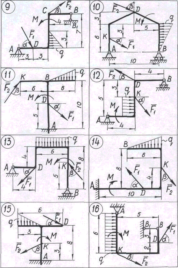 Жесткая рама (рисунки 2, 3, 4, 5) закреплена в точках А и В с помощью неподвижного шарнира либо шарнирной опоры на катках или присоединена к невесомому стержню с шарнирами на концах. На раму действует пара сил с моментом М, распределенная нагрузка интенсивностью