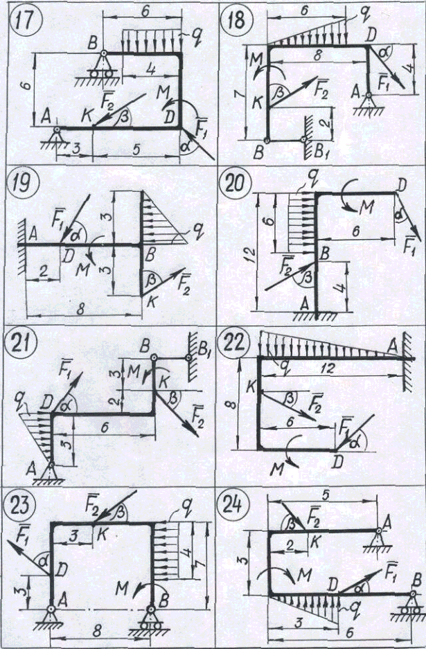 | Номер варианта | F1,Н | F2,Н | , град. | град. | М, Нм | q, Н/м |