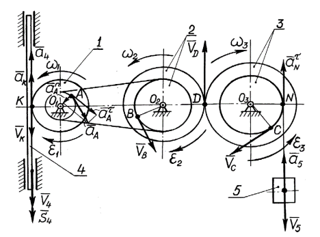 Для момента времени t = 1с определить и изобразить на рисунке (без масштаба) скорости и ускорения точек А, В, С механизма, а также скорости и ускорения рейки 4 и груза 5. Исходные данные к расчету приведены в таблице 3.