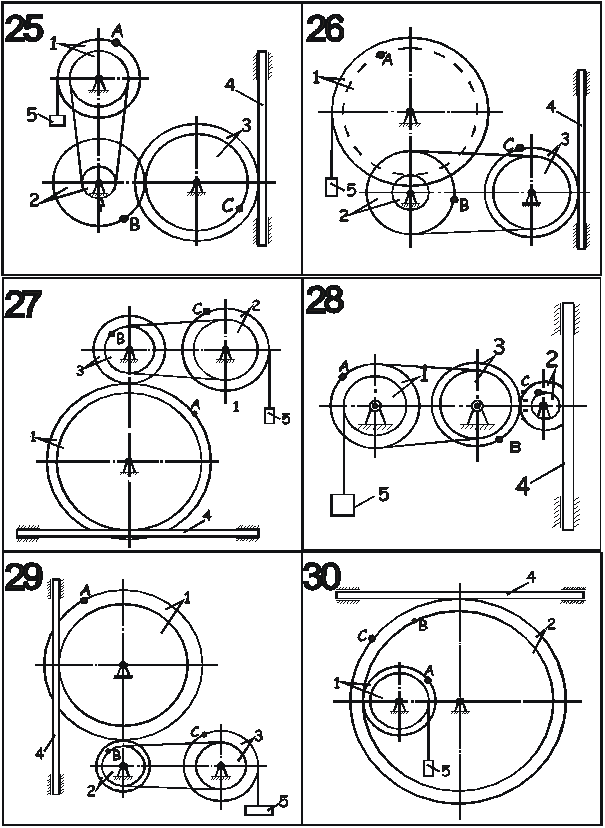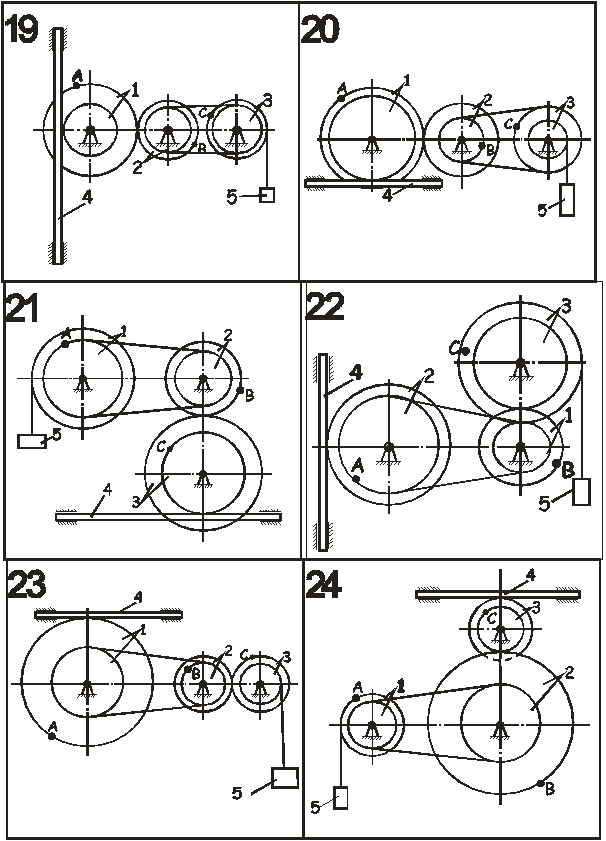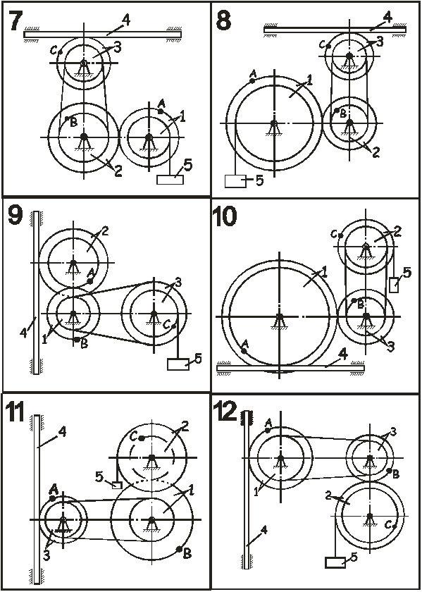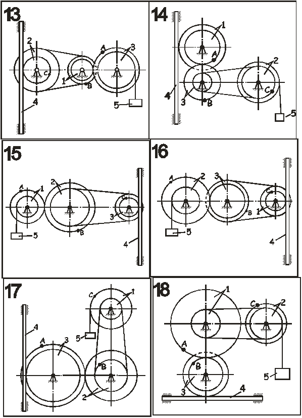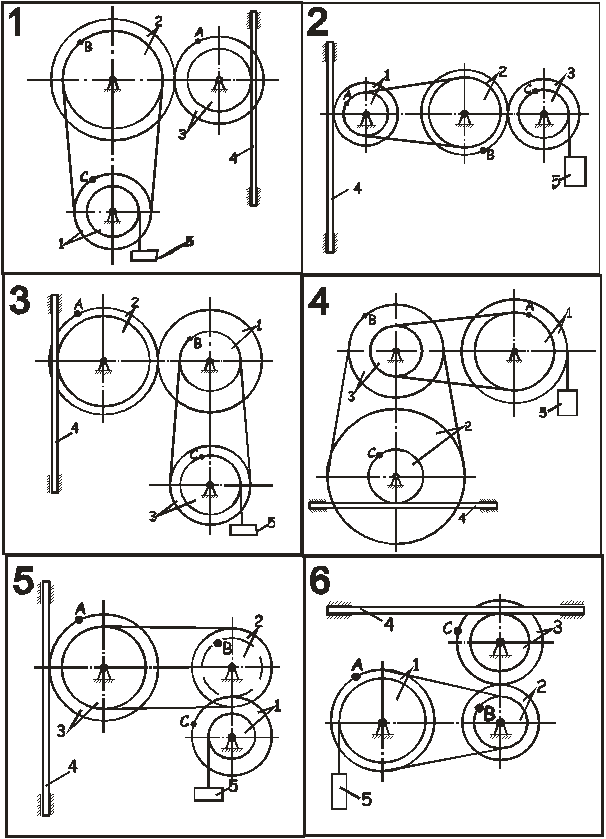 Механизм состоит из ступенчатых колес 1 и 2, связанных между собой ременной передачей, колеса 2 и 3 находятся в зацеплении, колесо 1 находится в зацеплении с зубчатой рейкой 4, груз 5 находится на конце нити, намотанной на шкив 3 радиуса