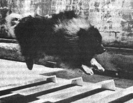 При некоторых способах обучения уклонение собаки от опасности – скажем, от электрического удара или холодной воды – может послужить более сильным стимулом, чем удовлетворение аппетита. Приведем пример. Вам желательно, чтобы собака входила в дом только через черный ход. Вы слышите, как она лает и просится в дом. Возможно, она испытывает потребность согреться, утолить голод или нуждается в вашем обществе. Но хотя вы постоянно даете свисток у задней двери и вручаете вошедшей в нее собаке лакомство, она продолжает лаять у парадной двери, может быть, потому, что чует там ваш запах. Ее надо остановить.