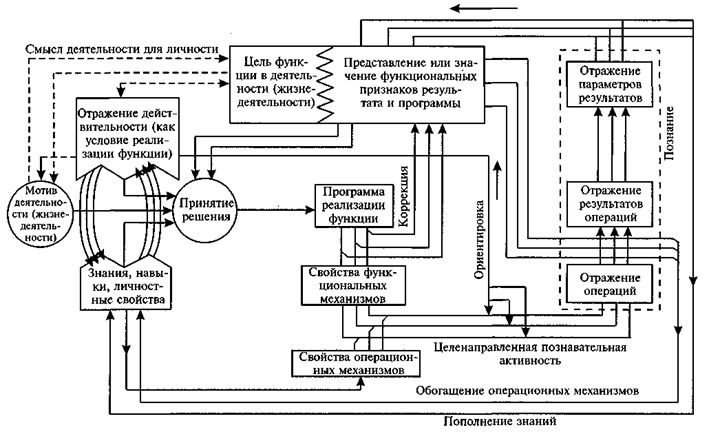 В. Д. Шадриков подчеркивает, что в процессе деятельности происходит тонкое приспособление операционных механизмов к требованиям деятельности, они приобретают черты оперативности (Д.А.Ошанин [166]; В.Д.Шадриков [262, 264]). Любую конкретную деятельность можно дифференцировать на отдельные психические функции. Психические функции реализуют наиболее общие, родовые формы деятельности, которые выступают в качестве исходных при ее анализе. Это дает основания В. Д. Шадрико-ву адекватно описать структуру психических функций психологической структурой деятельности, а развитие способности — как развитие системы, реализующей эту функцию, как процесс системогенеза. Вышеизложенные положения дают основания В. Д. Шад-рикову отразить структуру способности в виде формальной схемы (см. схему 1). Эта схема отражает лишь принципиальные моменты архитектоники способностей и позволяет приблизиться к пониманию механизма опосредования внешних воздействий через внутренние условия, важнейшие из которых — способности. Беря свое начало в функциональной системе трудовой деятельности, структура способностей, в свою очередь, помогает понять, как же функционирует сама система деятельности [264].