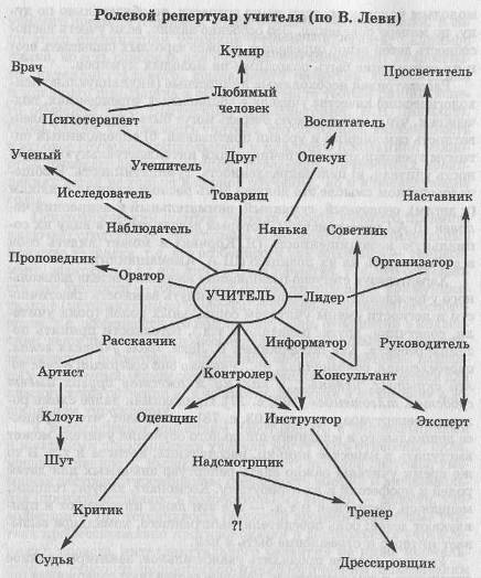 Характеризуя статусно-позиционные качества учителя дошкольного учреждения, необходимо подчеркнуть важность пластичности и легкости смены учителем социальных ролей (роли учителя, советчика, друга, родителя и т.д.), готовности принять позицию ребенка. Как подчеркивает В. Леви, «роль учителя ясная, определенная, однозначная, но... сколько она содержит в себе ролей скрытых, неявных, к какому множеству других имеет сродство, тяготение» [103, с. 77]. Приводимая далее схема ролевого репертуара учителя [103, с. 78] показывает, что в процессе дошкольного и младшего школьного обучения учитель может выступать в качестве няньки, рассказчика, артиста и т.д. В то же время учителю важно знать репертуар значимых для детей ролей и профессий и их атрибутику. Космонавт, хирург, гонщик, менеджер, бизнесмен и т.д. — все эти люди интересуют и привлекают детей; роль победителя, выигравшего, командира вызывает интерес и стремление быть в ней.