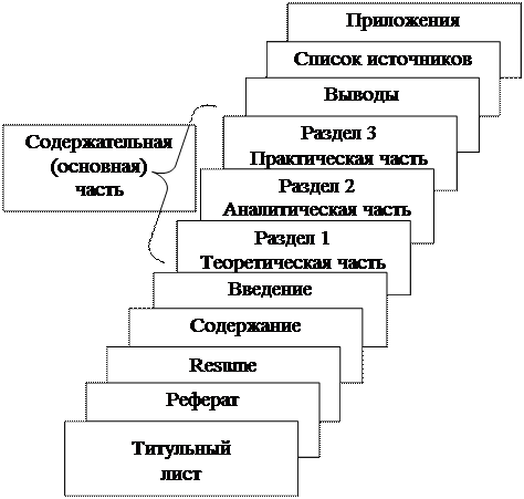 Структурными элементами ВКР являются: титульный лист, реферат, resume, содержание, введение, содержательная (основная) часть (разделы, подразделы / главы, пункты), выводы (заключение), список использованных источников, приложения, следующие строго один за другим (рис. 1).