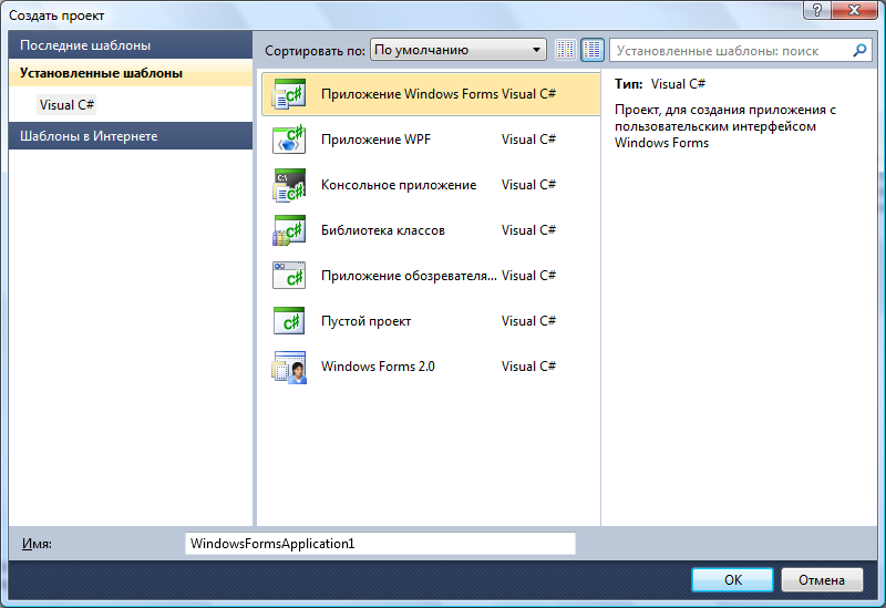 Слева в списке шаблонов приведены языки программирования, которые поддерживает данная версия Visual Studio: убедитесь, что там выделен раздел Visual C#. В средней части приведены типы проектов, которые можно создать. В наших лабораторных работах будут использоваться два типа проектов: