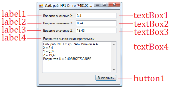 Работа с программой происходит следующим образом. Нажмите (щелкните мышью) кнопку “Выполнить”. В окне textBox4 появляется результат. Измените исходные значения x, y, z в окнах textBox1 – textBox3 и снова нажмите кнопку ”Выполнить” - появится новые результаты.