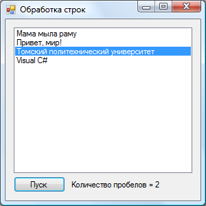 Задание: Написать программу подсчета числа слов в произвольной строке. В качестве разделителя может быть любое число пробелов. Для ввода строк использовать ListBox. Строки вводятся на этапе проектирования формы, используя окно свойств. Вывод результата организовать в метку Label.