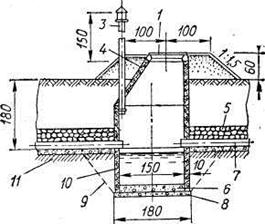1 -крышка; 2 - вентиляционная труба; 3 - отмостка; 4 - глиняный замок; 5 - железобетонный элемент; 6 - металлическое кольцо; 7 - просмоленная прядь; 8 - цементный раствор; 9 - галька; 10 - гравий; 11 - песок.