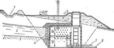 Рис.8.6. Железобетонная каптажная камера для нисходящего источника: 1 - канава; 2 - водоносный пласт; 3 - водоупорный пласт; 4 - обратный фильтр; 5 - заборная труба; 6 - переливная труба.