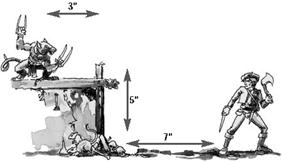 Скавен бежит (атакует) с крыши здания, прыгая вниз в процессе движения. Он пробегает 3" до края, затем прыгает вниз и должен проверить, насколько удачно было его приземление. Поскольку он прыгает на 5", ему придётся сделать два теста на Инициативу, чтобы избежать D3 попаданий с Силой 5. Если один из тестов провален, его передвижение закончится у подножия стены (если он не окажется вне игры). Если всё прошло удачно, он может продолжить атаку и пробежать оставшиеся 7".
