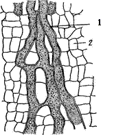 Приготовьте и изучите продольный срез корневища одуванчика, найдите во вторичной флоэме млечники, а при большом увеличении микроскопа рассмотрите латекс (густое зернистое содержимое млечников). Зарисуйте участок лубяной паренхимы с млечниками, укажите латекс, клетки лубяной паренхимы.