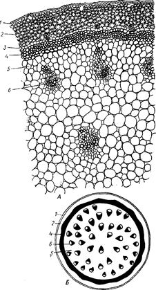 Рис. 9.1. Стебель ириса в поперечном разрезе (А) и схема поперечного разреза (Б): 1 – эпидерма, 2 – хлоренхима, 3 – эндодерма (2–3 – первичная кора), 4 – склеренхима перицикла, 5 – основная паренхима,