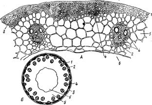 Рис.9.2. Стебель ржи в поперечном разрезе (А) и схема поперечного разреза (Б): 1 – эпидерма, 2 – склеренхима, 3 – хлоренхима, 4 – закрытый коллатеральный пучок, 5 – основная паренхима, 6 – полость