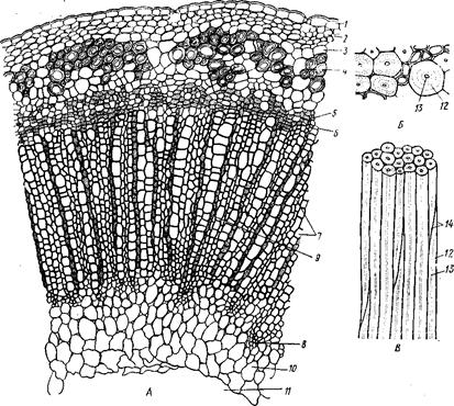 Рис.10.1. Стебель льна: A – поперечный разрез; Б и В – лубяные волокна в поперечном (Б) и продольном (В) разрезах: 1 – эпидерма, 2 – паренхима первичной коры, 3 – эндодерма, 4 – лубяные волокна, 5 – флоэма, 6 – камбий, 7 – вторичная ксилема, 8 – первичная ксилема, 9 – сердцевинный луч, 10 – паренхима сердцевины, 11 – полость, 12 – стенка клетки, 13 – полость, 14 – заостренные концы клетки