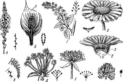 Рис.15.1. Простые моноподиальные соцветия и их схемы: А – колос (вербена – p. Verbena); В – початок (белокрыльник – Calla palustris); В – сережка (p. Populus); Г – кисть (черемуха – Padus racemosa); Д – щиток (груша – Pyrus communis); E – зонтик (лук – р. Alliит); Ж – головка (клевер –