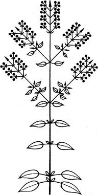 Рис.15.2. Сложные моноподнальные соцветия и их схемы: А – сложный колос (пырей – Agropiron repens); Б – сложный зонтик (укроп – Anethum graveolens); В – метелка (сирень – p. Syringa)