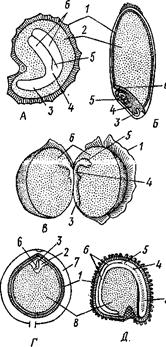 Рис.17.1. Типы семян. А – с эндоспермом, окружающим зародыш (мак – Papaver somniferum); Б – с эндоспермом, лежащим рядом с зародышем (пшеница – Triticum aestivum); В – с запасными веществами, отложенными в семядолях зародыша (горох – Pisum sativum); Г – с эндоспермом, окружающим зародыш, и мощным периспермом (перец – Piper nigrum), Д – с периспермом (куколь – Agrostemma githago)