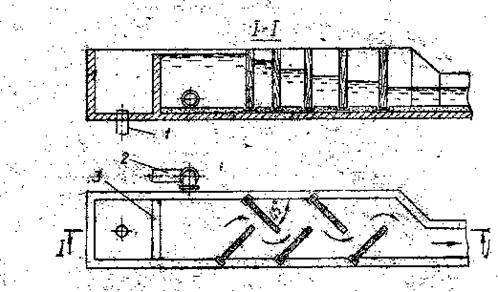 Равномерное распределение коагулянта в обрабатываемой воде обеспечивается с помощью перегородочных, дырчатых, шайбовых смесителей или насосов. Перегородочный (ершовый) смеситель - это лоток с несколькими вертикальными перегородками, поставленными под углом к направлению движения потока (рис. 8.17). Смешивается коагулянт с водой в результате интенсивных завихрений потока между перегородками. Дырчатый смеситель представляет собой такой же лоток, но с дырчатыми поперечными перегородками. Шайбовые смесители -это вставка с диафрагмой, устанавливаемая на трубопроводе. Смешивание происходит здесь вследствие резкого изменения режима движения воды при движении ее сквозь диафрагму.