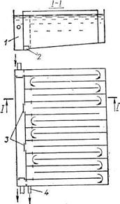 1 - обводный канал; 2 - окно в перегородке для перепускания осадка; 3 - промежуточные выпуски; 4 - выпуск осадка.