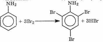 В ароматических аминах аминогруппа ориентирует другие заместители в орто- и пара-положения бензольного кольца. Поэтому галогенирование анилина происходит быстро и в отсутствие катализаторов, причем замещаются сразу три атома водорода бензольного кольца, и выпадает белый осадок 2,4,6-триброманилина (о,о,п-триброманилина):