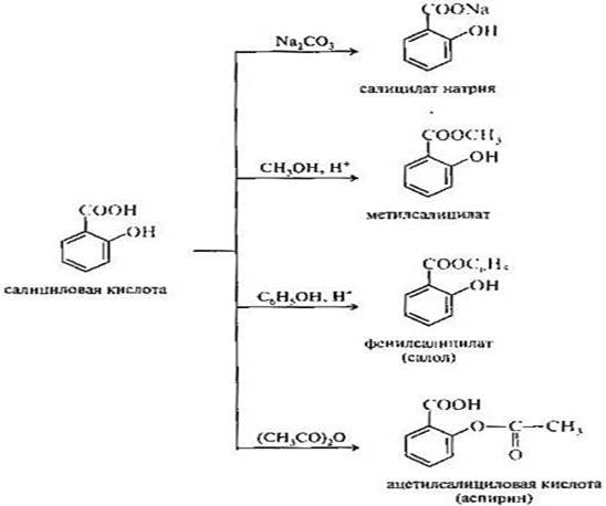 Салициловая кислота проявляет антиревматическое, жаропонижающее и антигрибковое действие, но как сильная кислота (рКа 2,98) вызывает раздражение пищеварительного тракта и поэтому применяется только наружно. Внутрь применяют ее производные — соли или эфиры. Салициловая кислота способна образовывать производные по каждой функциональной группе. Практическое значение имеют салицилат натрия, сложные эфиры по карбоксильной группе — метилсалицилат, фенилсалицилат (салол), а также по гидроксильной группе — ацетилсалициловая кислота (аспирин). Из других производных салициловой кислоты большое значение имеет п-аминосалициловая кислота (ПАСК) как противотуберкулезное средство. ПАСК является антагонистом п-аминобензойной кислоты, необходимой для нормальной жизнедеятельности микроорганизмов. Другие изомеры таким действием не обладают. м-Аминосалициловая кислота является высокотоксичным веществом.
