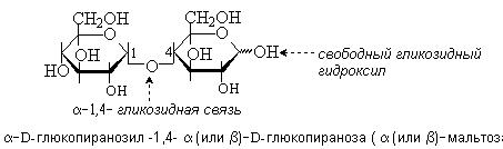 Мальтоза содержится в солоде и образуется при неполном гидролизе крахмала. Молекула мальтозы состоит из двух остатков α-D-глюкопиранозы. Гликозидная связь между ними образована за счет полуацетального гидроксила в ά-конфигурации одного моносахарида и гидроксильной группы в положении 4 другого моносахарида.