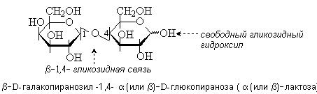 Лактоза содержится в молоке (4-5%). Молекула лактозы состоит из остатков βD-галактопиранозы и α-D-глюкопиранозы, связанных β-1,4-гликозидной связью. Лактоза – восстанавливающий дисахарид.