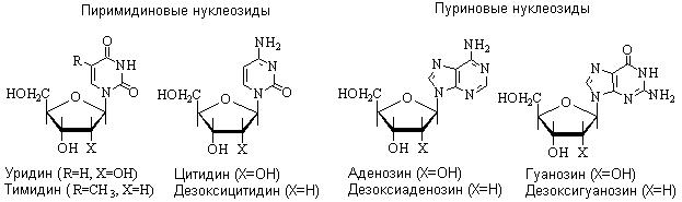 Нуклеозиды – это N-гликозиды, образованные нуклеиновыми основаниями (урацилом, тимином, цитозином, аденином и гуанином) и рибозой или дезоксирибозой. Связь между нуклеиновым основанием и углеводным остатком называется гликозидной.