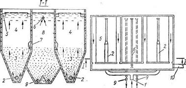 Прямоугольные в плане осветлители коридорного типа (рис. 8.22) разделенны внутренними перегородками на три отдела. Вода из смесителя поступает в осветлитель через трубу 1 и дырчатые трубы 2 распределяется в рабочей зоне 3 осветлителя. Зависание хлопьев коагулянта достигается подхватыванием вертикальных восходящих скоростей потока воды. Над слоем взвешенного осадка расположена защитная зона 4. Отводят воду через лотки 5. В среднем отделе осветлителя (шламоуплотнители (8.36)).