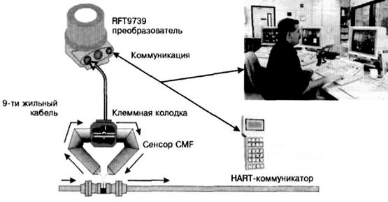 Соотношение между массой и собственной частотой колебаний сенсорной трубки - это основной закон измерения плотности в кориолисовых расходомерах. В рабочем режиме задающая катушка питается от преобразователя, при этом сенсорные трубки колеблются с их собственной частотой. Как только масса измеряемой среды увеличивается, собственная частота колебаний трубок уменьшается; соответственно, при уменьшении массы измеряемой среды, собственная частота колебаний трубок увеличивается. Сенсоры серии ELITE®(CMF), погрешность измерения плотности 0,5 кг/м3. Номинальный диаметр трубопровода от 3 до 150 мм. Модели: CMF010, CMF010P, CMF025, CMF050, CMF100, CMF200, CMF300, CFM300A, CMF400. Преобразователь модели RFT9739, цифровые выходы HART (Bell 202). ЖКИ. Температурный диапазон (-240, 204)°С. Цифровой сигнал с интеллектуального датчика поступает на контроллер, где высвечивается величина значения плотности. Цифровой сигнал поступает также на вход ПК, где величина плотности может быть распечатана и использована по назначению (например, для построения графика изменения этой величины).