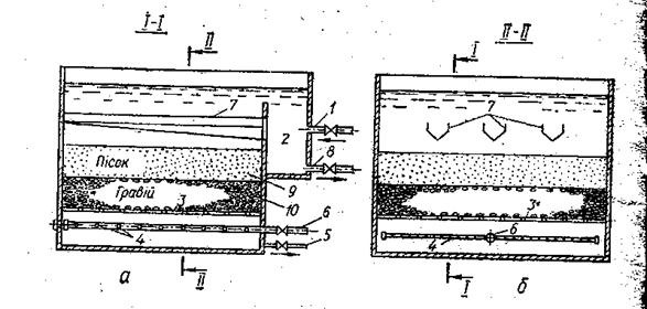 Промывка фильтра для восстановления фильтрующей способности материала заключается в подаче на фильтр снизу вверх большого количества воды. Эта вода захватывает отфильтрованные вещества, которые смываются с поверхности песка вследствие взаимного трения частичек. Загрязненная вода поднимается к уровню желобов и удаляется через них в водосток, сливаясь по трубе 8. Быстрые фильтры промывают 1-1 разы на сутки, в зависимости от качества исходной воды. Интенсивность промывки — не меньше 12-15 л/сек на 1 м2 площади фильтра, продолжительность — 5-7 мин. Фильтрующий слой состоит из отсеянного кварцевого речного песка 9 с крупностью зерен 0, 5-5,8 мм при толщине слоя 0, 7-7 м. Поддерживающий гравийный слой 10 состоит из гравия размером от 2-12 до16—32 мм и имеет высоту до 0,4-5 м. Дренаж обеспечивает равномерный отвод фильтрованной воды, а также равномерное распределение воды промывки фильтра. По величине гидравлической нагрузки, которая играет большую роль в равномерном распределении воды, дренажи разделяют на две группы: большой и малой нагрузки. Дренажи большой нагрузки бывают трубчатые и колпачковые. Наиболее распространенные - трубчатые, которые представляют собой систему дырчатых чугунных или стальных труб, укладываемые параллельно на расстоянии 0, 15-0,3 м одна от одной в нижних слоях гравия и присоединяются к коллектору (труба большого диаметра), расположенных посреди днища фильтра параллельно к его длинной стороне.