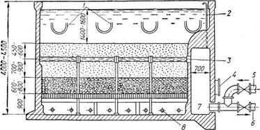 1 - желоба; 2 - воздушная трубка; 3 -щелевой дренаж; 4 - люк; 5 - труба для промывной воды; 6 - труба для осветленной воды; 7 - канал чистой воды; 8- трубы распределительной системы.