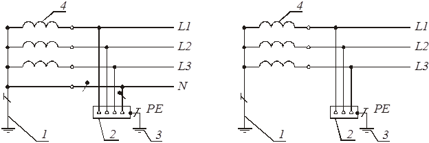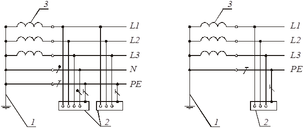 – L1, L2, L3 – фазные проводники источника питания, находящиеся под напряжением;