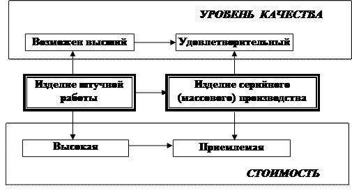 Серийный выпуск изделий потребовал пропорционального увеличения ресурсов и мог стать рентабельным только при сокращении вложенного в них овеществленного труда. Снизить себестоимость изделий можно было за счет упрощения конструкции (в первую очередь отказа от «излишеств» – дорогих материалов, трудоемких украшений, сложных и по этой причине трудновыполняемых деталей и сборочных единиц), создания условий для обеспечения их повторяемости и изменения технологии. Конечно, уровень качества таких изделий трудно поднять до наивысшего, но при их проектировании можно заложить приемлемый (удовлетворительный) уровень качества, который представляет собой компромисс между желаниями потребителя и возможностями изготовителя. Изменение характеристики производства при его трансформации от индивидуального изготовления изделий к серийному представлен на рис. 1.1.