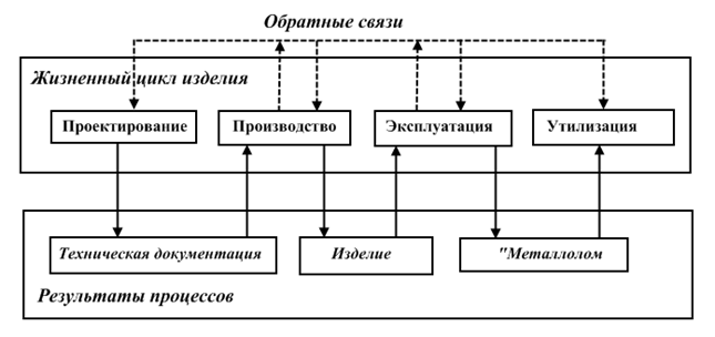 «Жизненный цикл» изделия строится с учетом не только прямых связей (качество сложного изделия закладывается при проектировании, обеспечивается в ходе производства, реализуется при эксплуатации), но и обратных связей, которые используются для корректирования требований, обеспечивающих приемлемый уровень качества объекта.