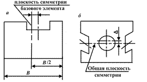 Отклонение от симметричности (рис. 3.17) рассматривают либо относительно оси или плоскости симметрии базового элемента либо относительно общей плоскости симметрии. Оно определяется наибольшим расстоянием между принятой базой и плоскостью (осью) симметрии рассматриваемого элемента в пределах нормируемого участка.