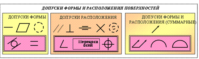 На рисунке 3.24 представлены условные обозначения – допуски формы и расположения поверхностей, нормируемые и не нормируемые стандартом ГОСТ 30893.2. Обозначения допусков, значения которых стандарт общих допусков формы и расположения не регламентирует, выделены двойной.