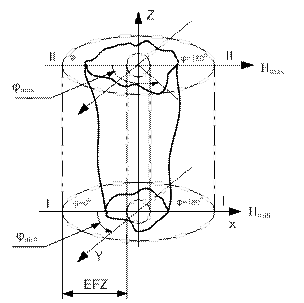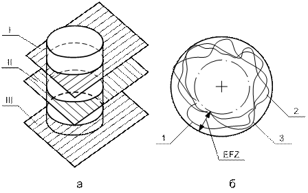 При контроле таких частных видов отклонения профиля продольного сечения, как конусообразность, седлообразность или бочкообразность измеряют диаметры поверхности в трех поперечных сечениях (двух крайних и одном среднем) в точках, принадлежащих одному продольному сечению, а искомое отклонение профиля продольного сечения EFP находят по формуле