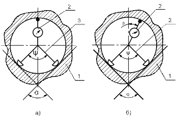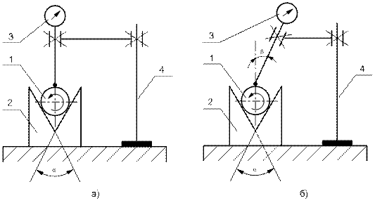 Различают симметричную схему измерений, когда ось измерительного наконечника располагается по биссектрисе угла призмы α и несимметричную схему, когда ось измерительного наконечника располагается под углом β к биссектрисе. При реализации измерительной процедуры контролируемый вал устанавливают в призме и вращают, при этом определяют наибольшее изменение показаний измерительной головки