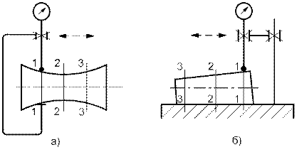 Особое место занимает контроль отклонения оси поверхности от прямолинейности или изогнутости оси. Оно в принципе не может быть измерено с использованием накладного прибора, и для его контроля на практике используют различные станковые средства измерений (рис. 3.48).