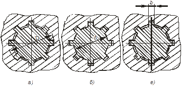 На схемах центрирования по наружному диаметру D (рис. 3.112 а); по внутреннему диаметру d (рис. 3.112 б); по боковым сторонам зубьев b (рисунок 3.110 в) условно показаны зазоры по нецентрирующим диаметрам.
