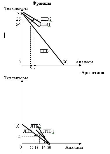 Но если условия торговли изменились в пользу Франции, то это будет означать, что теперь Франция, скажем за 4 телевизора должна получать не 6 ед.ананасов, а 7 ед.ананасов, то это будет означать, что угол наклона ЛТВ Франции увеличится, а угол наклона линии торговых возможностей Аргентины уменьшится, что и отражено стрелками на рисунке 4.