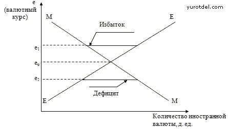 На рисунке 6 описан рынок иностранной валюты с помощью графика в координатах валютного курса (вертикальная ось) и количества иностранной валюты (горизонтальная ось).