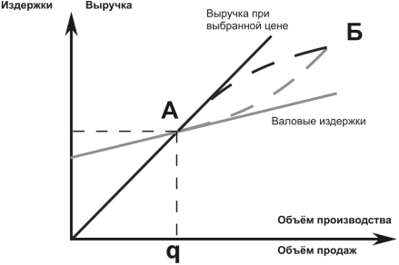 Точка безубыточности (ТБ) «А» - точка пересечения линии выручки и линии валовых издержек - показывает такой объём продаж (производства) «q», при котором общие издержки равны общей выручке при предлагаемой цене или объём продаж (производства), при котором фирма не имеет ни прибылей, ни убытков.