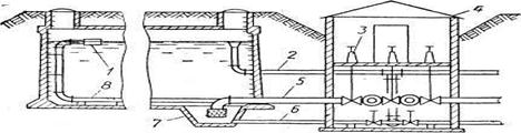 1- поплавковый клапан; 2 - переливная труба; 3 - колонка для управления заслонками; 4 - камера заслонок; 5 - всасывающий трубопровод; 6- грязевая труба; 7 -приямок; 8 - подающий трубопровод.